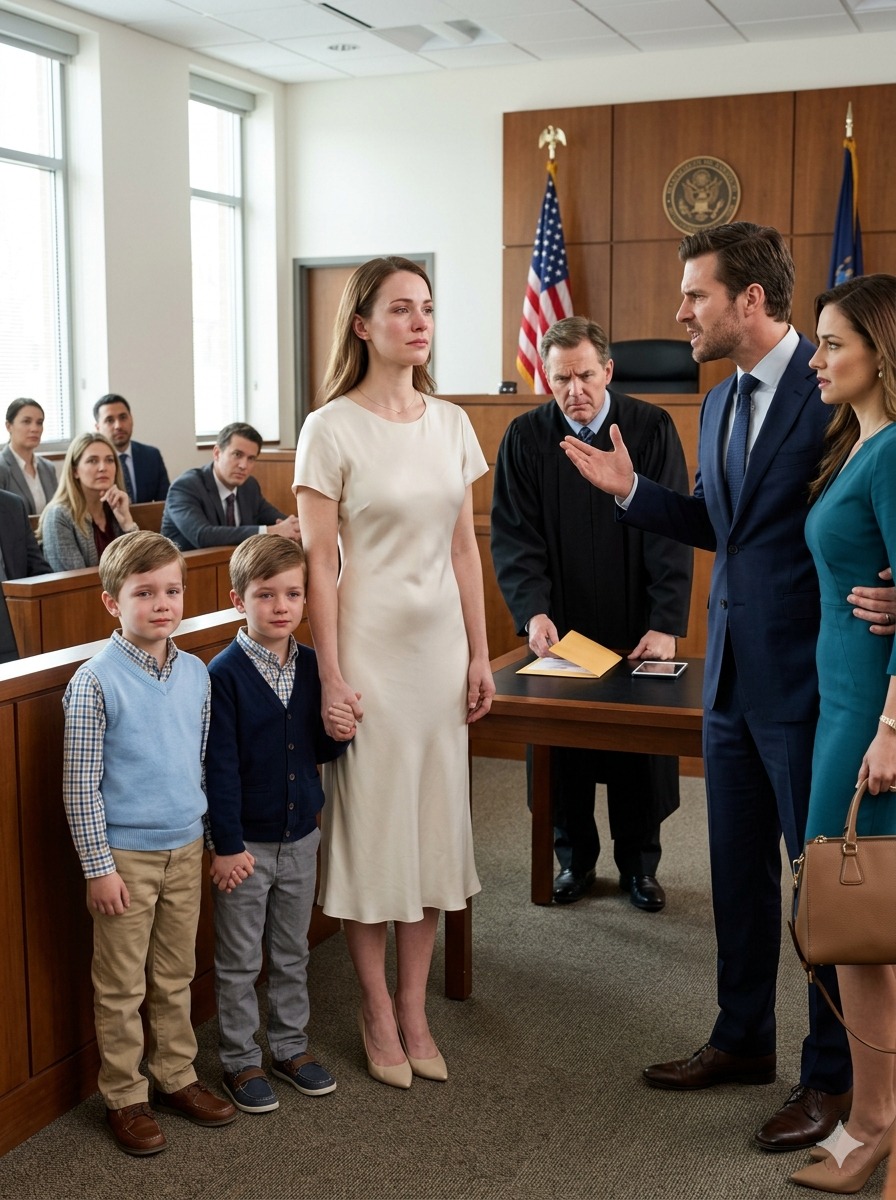She simply walked forward, step by step, until she stood before the judge’s bench, the twins still holding her hands, their quiet presence somehow louder than any words that could have filled the room.