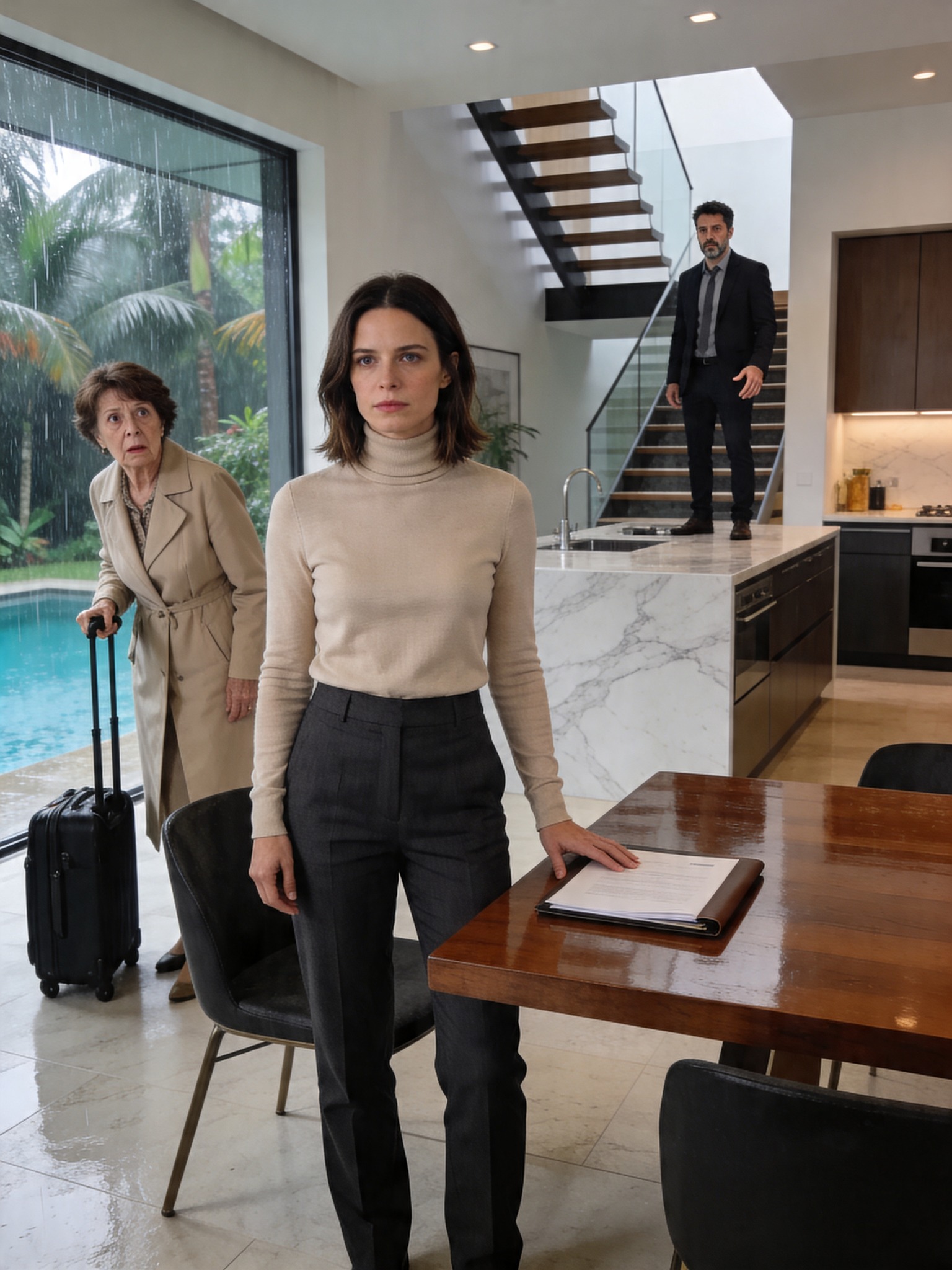 I did not rush downstairs to meet them, but instead I finished my coffee while the sound of the rain hit the windows overlooking the garden and the pool. When I finally entered the kitchen, Beulah was already standing by the island with an immaculate wool coat and a cup of tea in her hands.