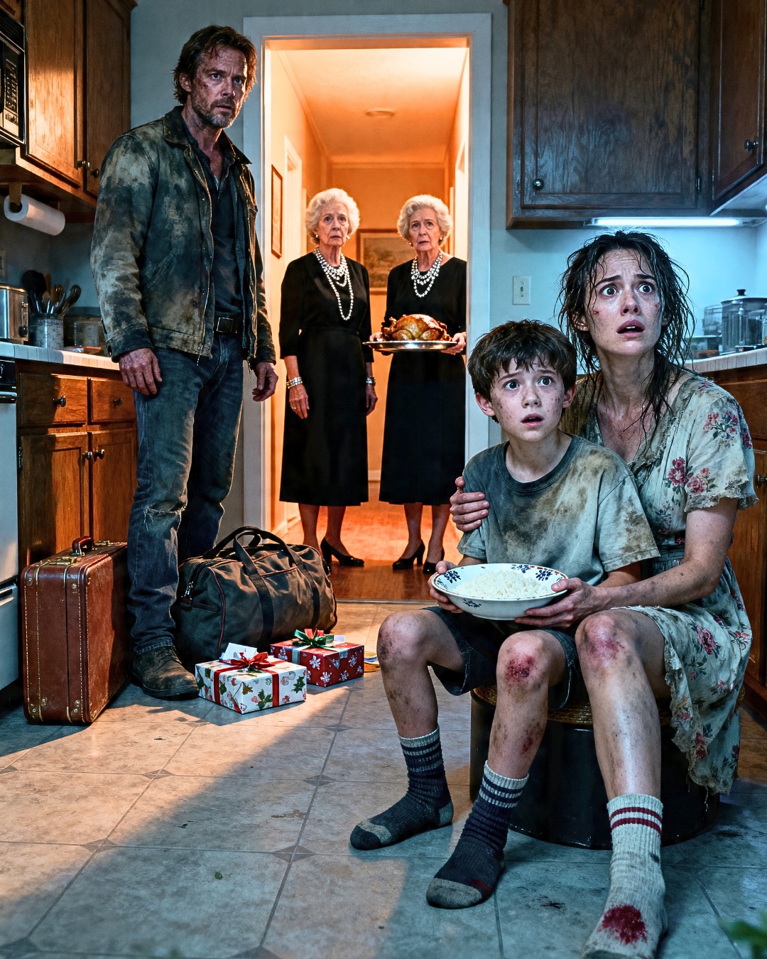 The room didn’t quiet all at once. First a few people noticed me. Then more. Then the music suddenly seemed too loud, and one by one conversations snapped as the guests turned toward the man standing in the doorway with a dusty suitcase at his feet, a child on his hip, and a plate of rotten rice in his hand.