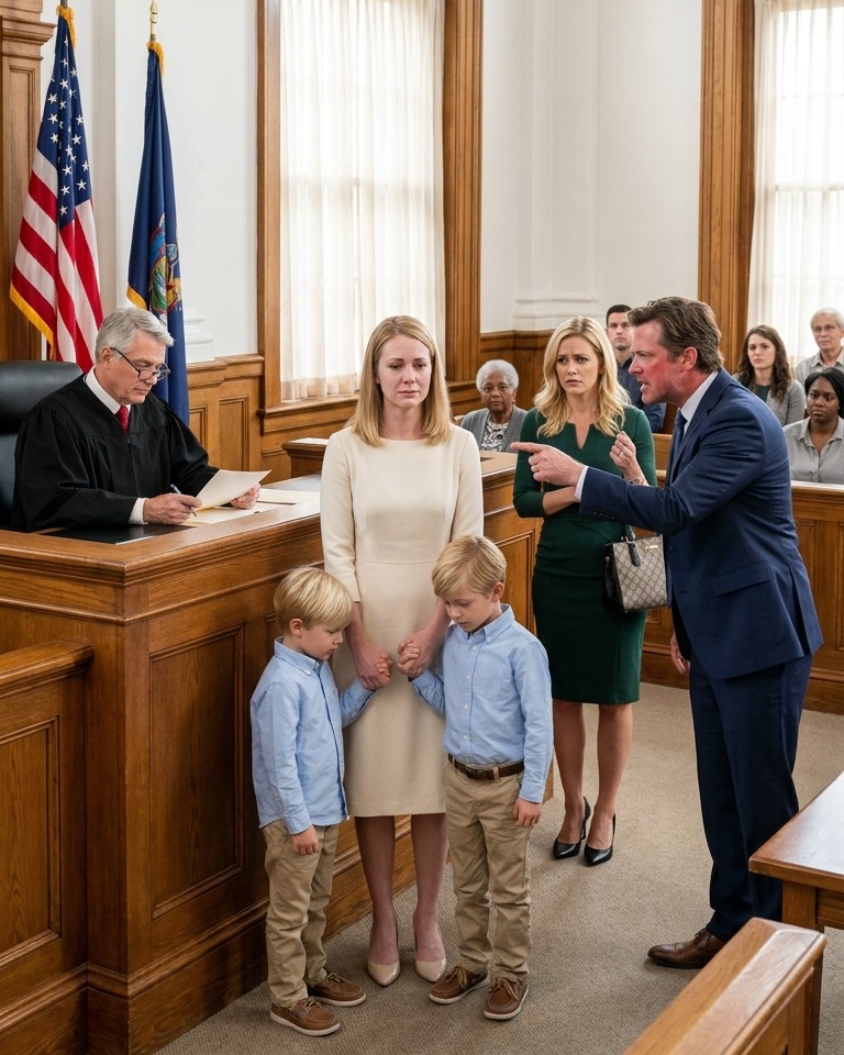 “You’ll Leave With Nothing… And I’ll Take The Kids,” My Husband Said As His Mistress Smiled In Court — But When I Walked In With Our Twin Boys, The Truth About His Company Made Even The Judge Go Silent