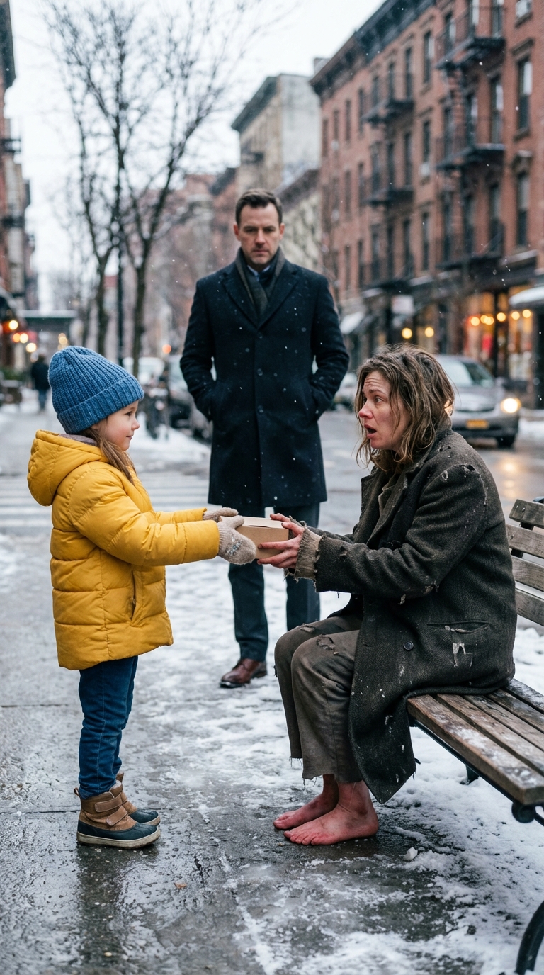 People hurried past her with boots crunching over snow, scarves wrapped tightly, and hands gripping warm drinks and shopping bags as if comfort was something guaranteed. No one stopped, no one stared, and no one noticed the young woman with a worn backpack and bare feet tucked beneath the bench.