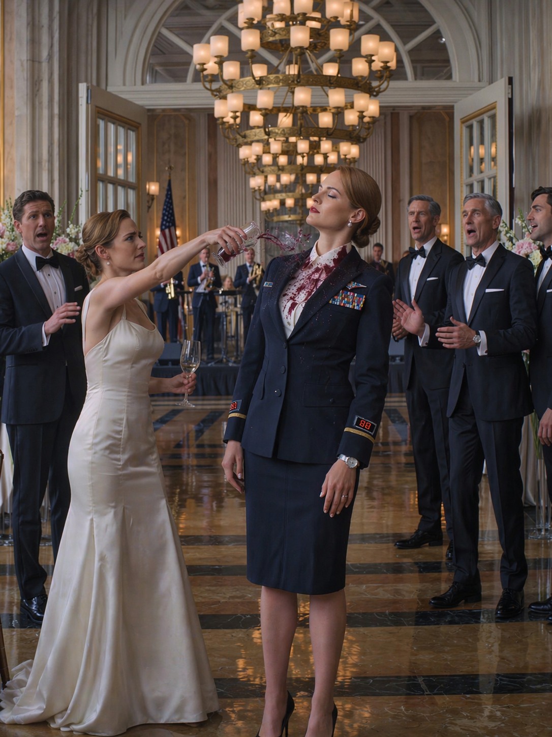 The sound of glass shattering against the marble floor echoed through the ballroom like a sudden gunshot. A second later, a cold and wet sensation slammed into my chest as red wine began to soak into my Class A uniform.