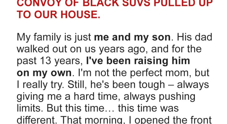 Three men in black suits stood on our porch. Behind them, a convoy of SUVs stretched down our cracked little street like a scene from a political thriller.