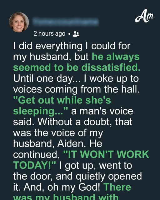 “Get out, I think she’s home…” I heard Aiden whispering. He continued, “It won’t work today.” I got up, went to the door, and quietly opened it. I was stunned when I saw a beautiful brunette standing in the hall.