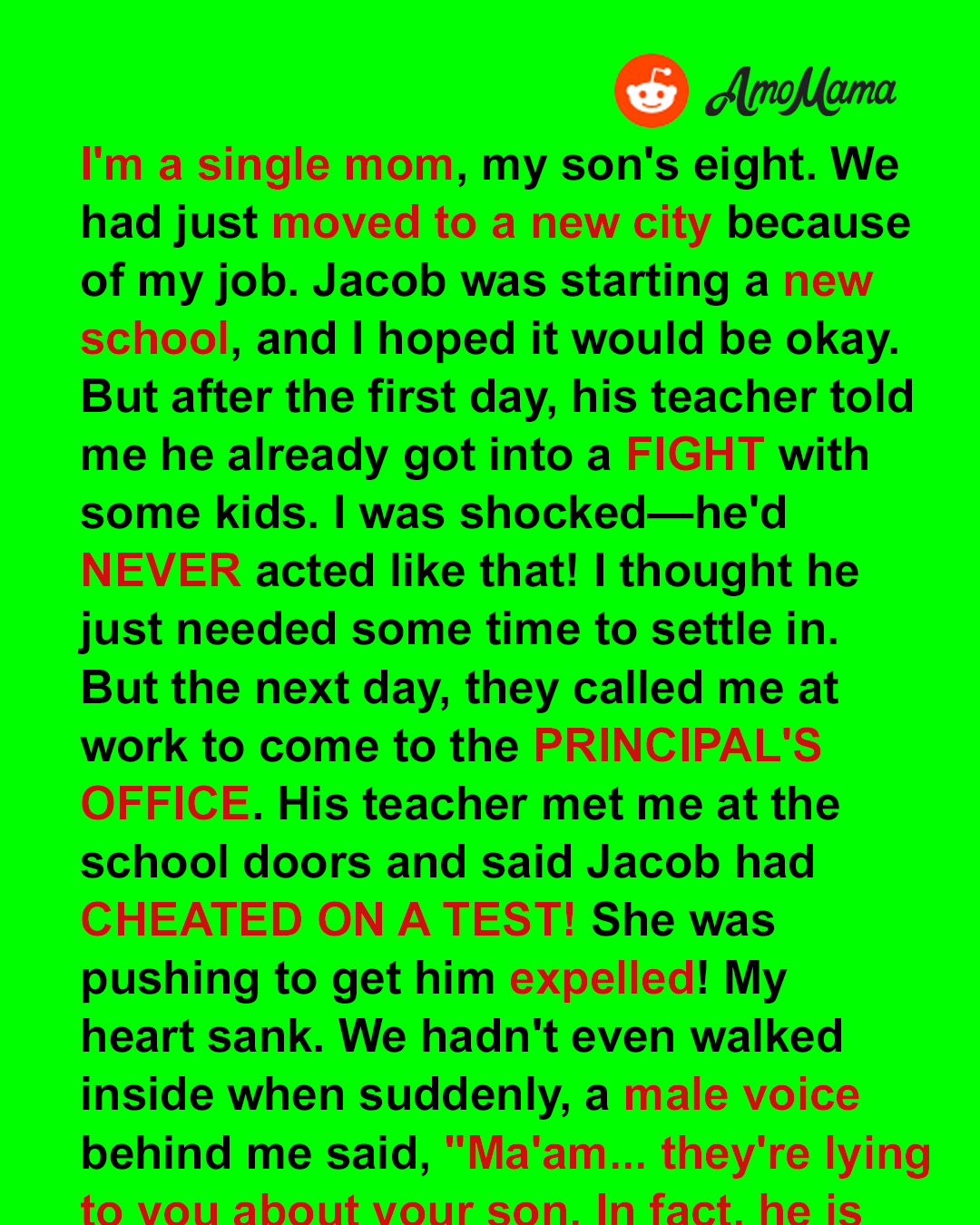 “Jacob, how was your first day at your new school?” she asked in a sweet tone, too sweet.