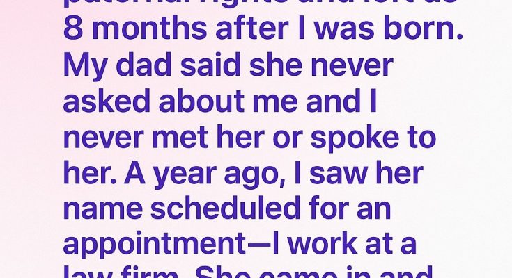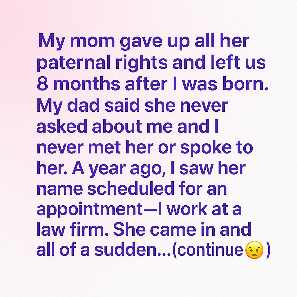 My mom gave up all her parental rights and left when I was just 8 months old. Growing up, my dad told me she never asked about me, and so I never met her, never spoke to her, never even saw a picture of her as an adult. She was just a name—someone who existed, but not really in my world.About a year ago, while working at the law firm, I noticed a familiar name on the schedule for an appointment.