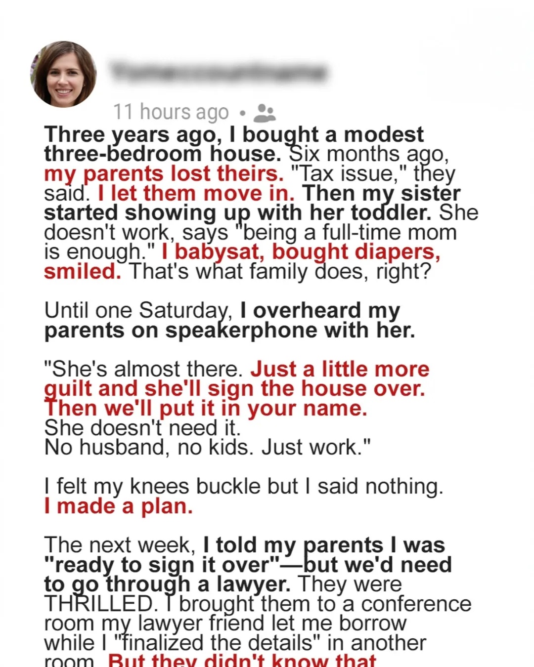 I stayed calm and devised a plan. Pretending to agree, I arranged a meeting at a lawyer’s office. With my parents in one room, I gave Claire fake papers in another, asking if she’d place them in care if I gave her the house.