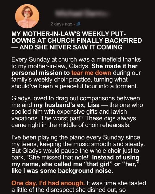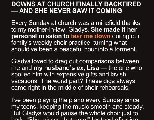 Every Sunday at church was a minefield thanks to my mother-in-law, Gladys. She made it her personal mission to tear me down during our family’s weekly choir practice, turning what should’ve been a peaceful hour into a torment. Gladys loved to drag out comparisons between me and my husband’s ex, Lisa — the one who spoiled him with expensive gifts and lavish vacations.