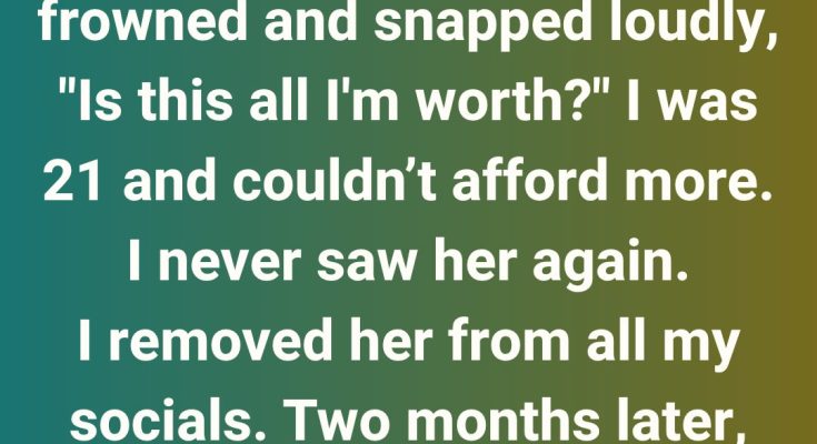 When she saw the ring, she frowned and snapped loudly, “Is this all I’m worth?” I was 21 and couldn’t afford more. I never saw her again. I removed her from all my socials.