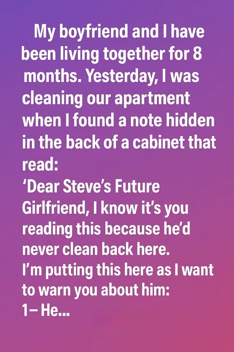 Instead, I started a conversation we’d avoided for months. The note didn’t break us—it opened a door. And sometimes, the truth doesn’t come crashing in; it waits quietly behind a cabinet, tucked away until you’re ready to find it.