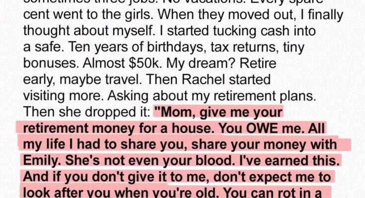 “I need you to give me your retirement money, Mom,” she said simply.