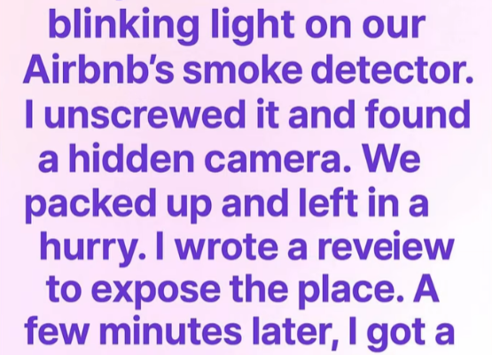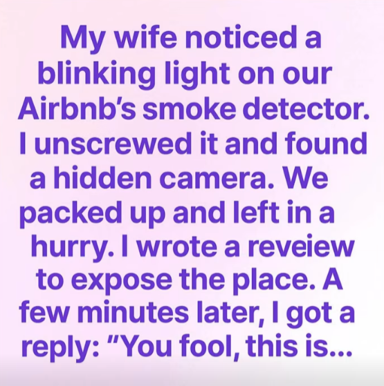 In our Airbnb, a blinking smoke detector hid a camera. We packed and fled. From a diner, I posted a warning—only to get a reply: