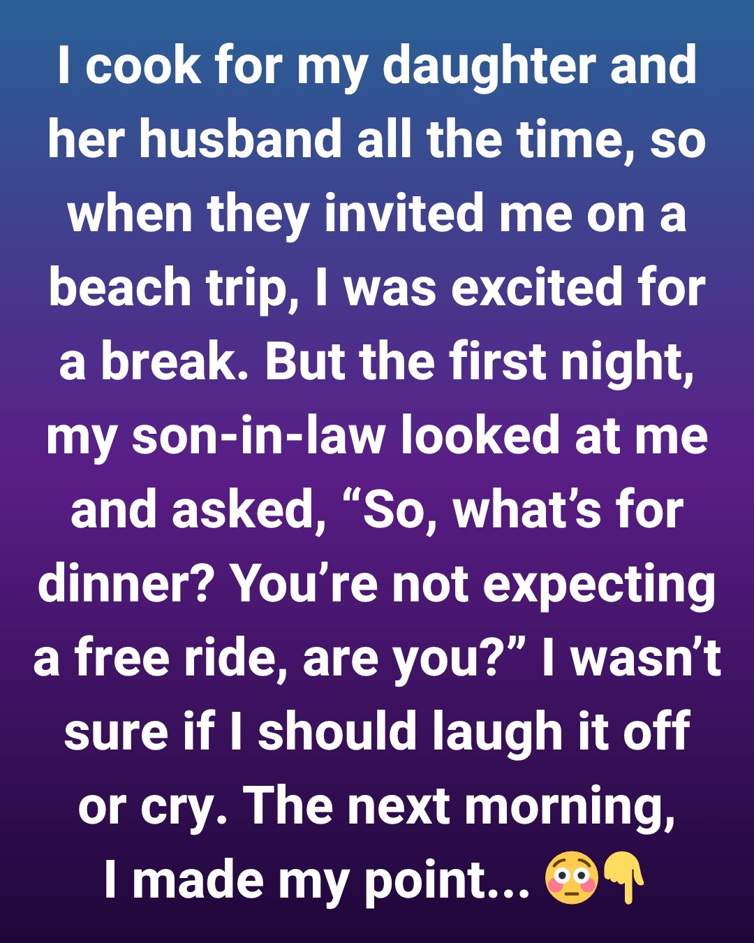 I was genuinely excited. But the moment we arrived, my son-in-law turned to me and said, “So, what’s for dinner? You’re not expecting a free ride, are you?” I wasn’t sure if I should laugh it off or cry.