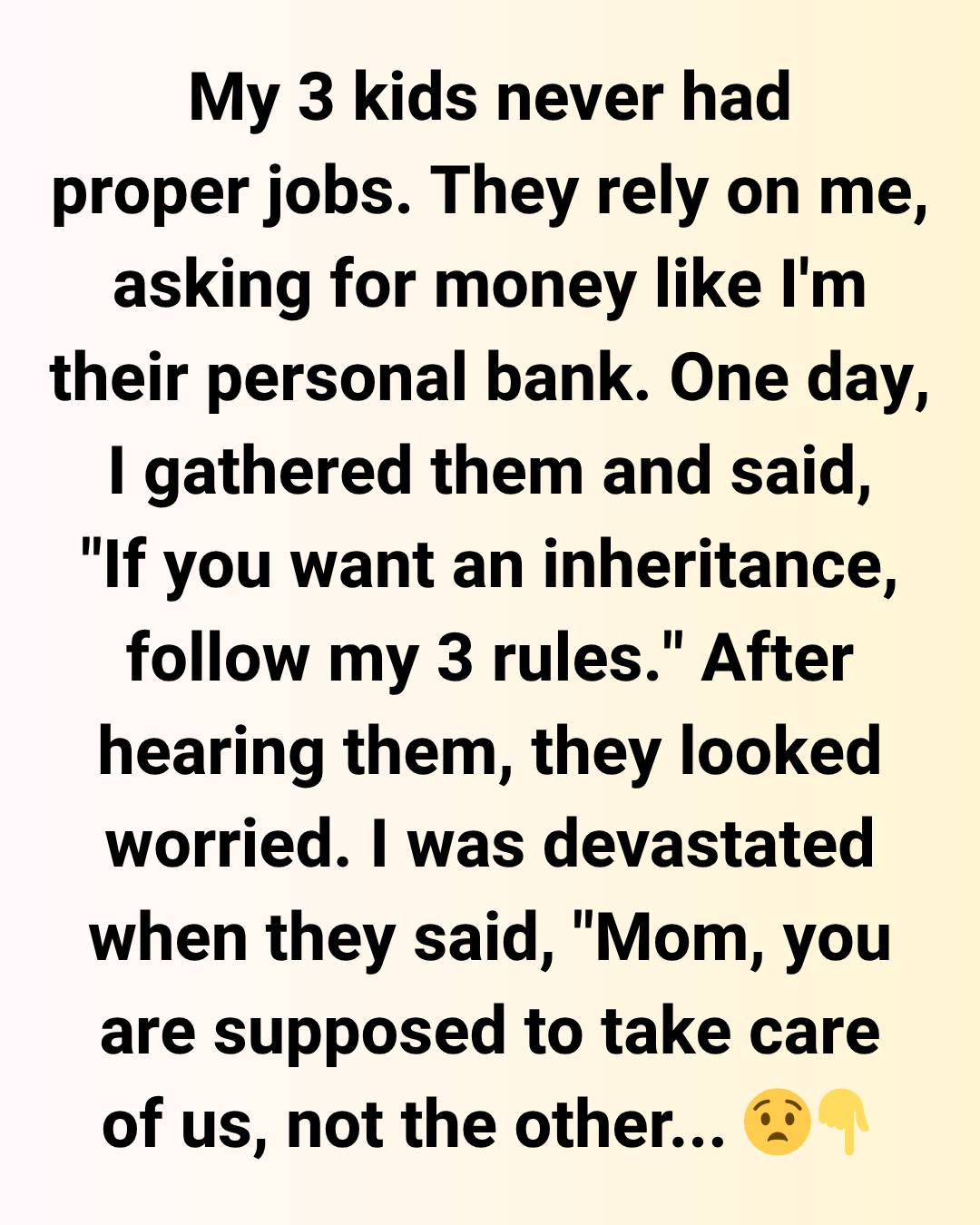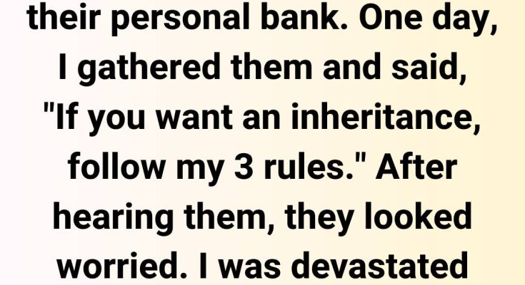 My 3 kids never had proper jobs. They rely on me, asking for money like I’m their personal bank. One day, I gathered them and said, “If you want an inheritance, follow my 3 rules.” After hearing them, they looked worried.