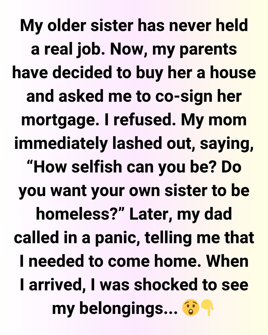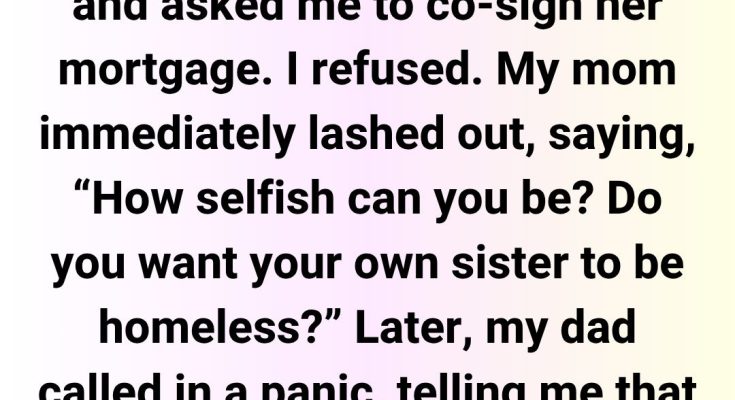 I’m 25 and work as a lawyer, but right now, I’m caught in a serious conflict with my family. My older sister (27) has never held a real job—she’s always been financially dependent on our parents. Now, they’ve decided to buy her a house to “secure her future” and asked me to co-sign her mortgage since I’m financially stable.