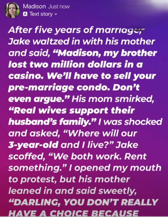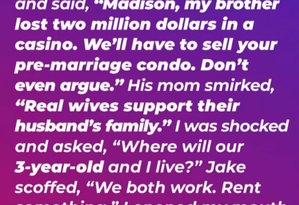 Maddie’s husband Jake and his mother Patricia demand she sell her pre-marriage condo to cover brother-in-law Max’s $2M gambling debt.