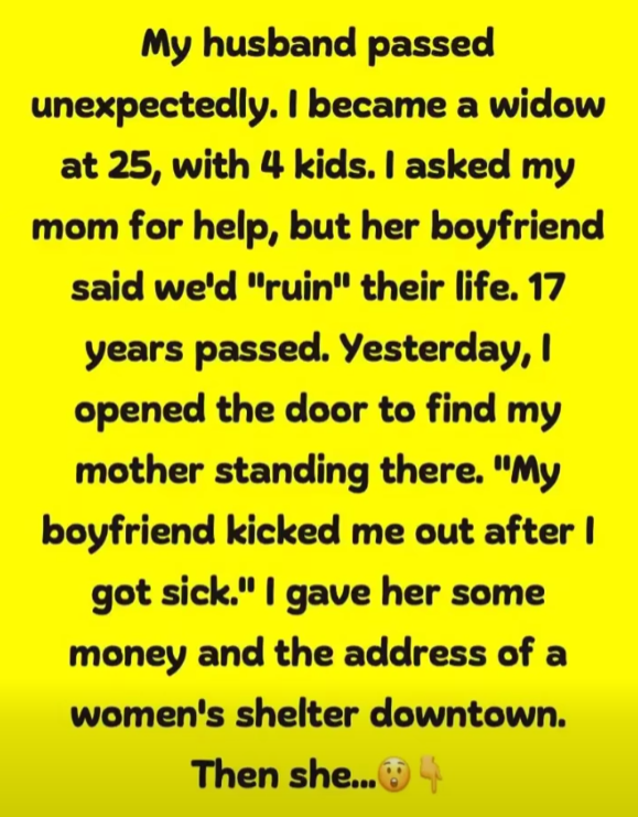 Lauren lost her husband young and raised four children alone after her mother abandoned her for a boyfriend 17 years earlier. When her mother recently returned homeless and sick, begging for help, Lauren refused to let her stay. She gave her money and shelter information but closed the door, torn between compassion and protecting the family she built without her.