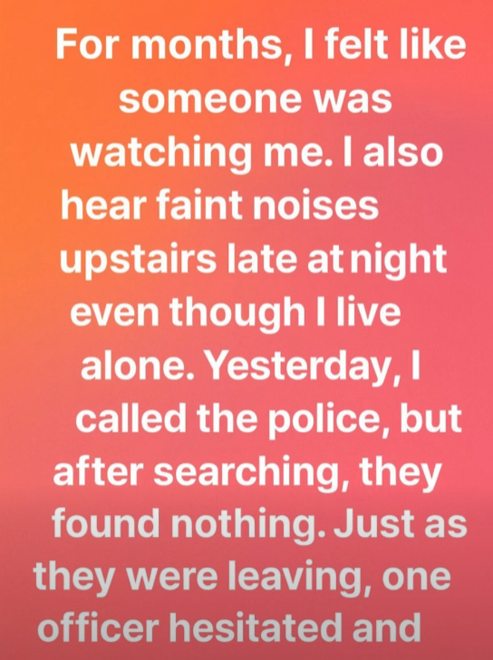 For months, I felt it. Eyes on me. Noises upstairs at night. But I lived alone.