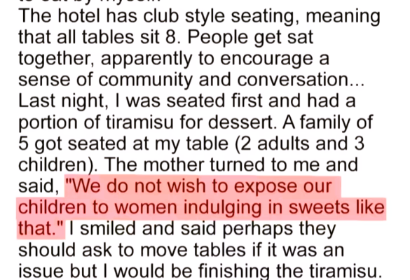 When I came back from refilling my water, my dessert was gone. She’d lied to the waiter and had it taken away.