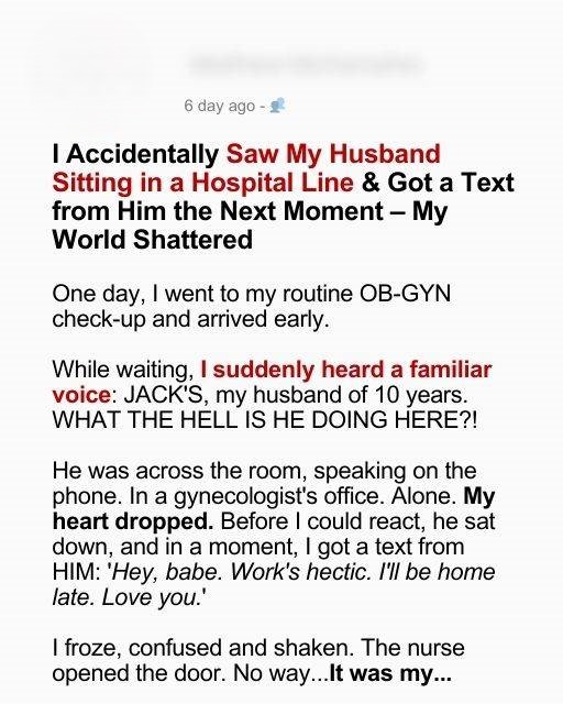 One day, I went to my routine OB-GYN check-up and arrived early. While waiting, I suddenly heard a familiar voice: JACK—my husband of 10 years. WHAT THE HELL IS HE DOING HERE?!