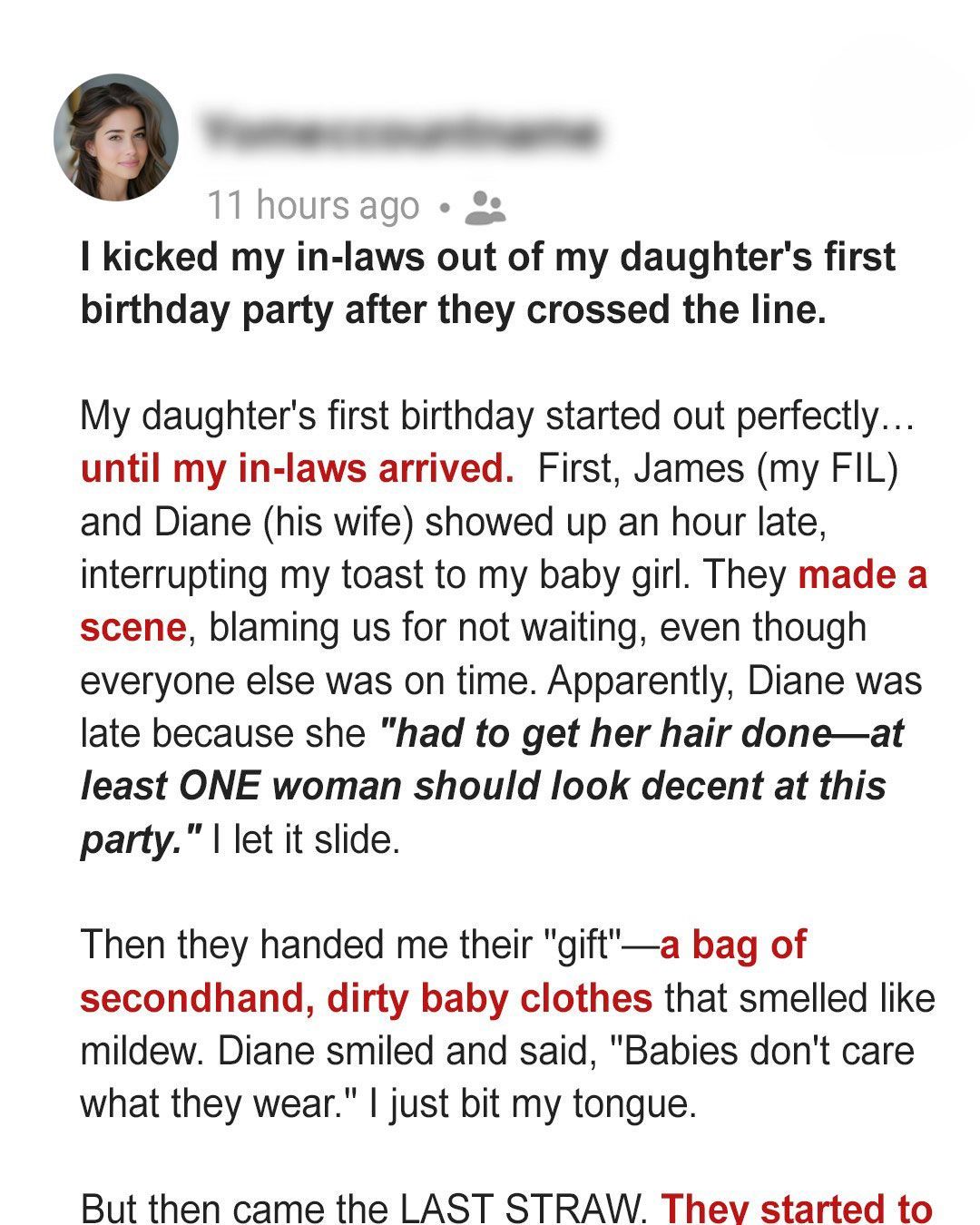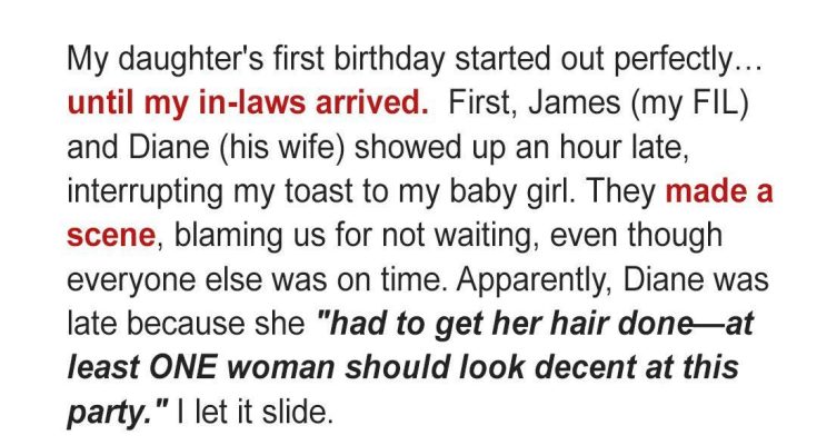 But when his parents arrived late, their critical comments and disregard for our simple house rules quickly turned the day into a test of patience. At first, I tried to keep smiling. They had always been difficult to please, but I believed that family could set differences aside for something as precious as their granddaughter’s special day.