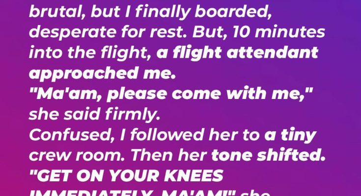 But just ten minutes into the flight, a flight attendant approached and gently said, “Ma’am, could you please come with me?” Confused, I followed her to a small crew area near the back. Her expression turned serious as she asked me to kneel carefully. My heart raced — I didn’t understand why.