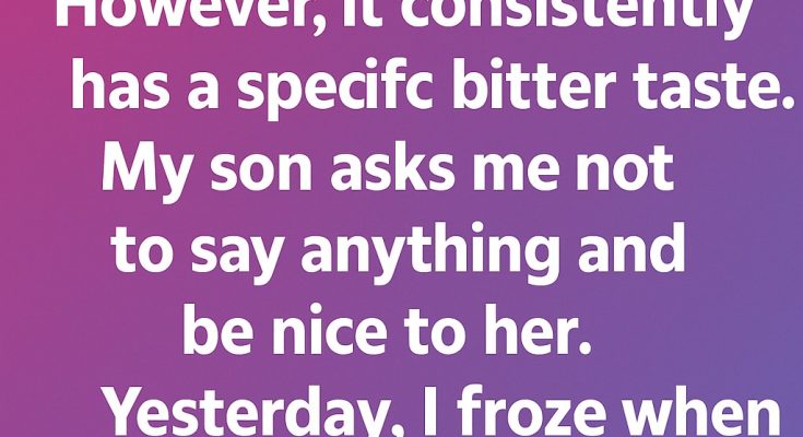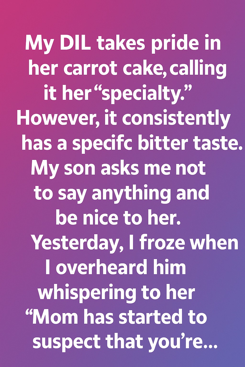 My DIL takes pride in her carrot cake, calling it her “specialty.” However, it consistently has a specific bitter taste. My son asks me not to say anything and just be nice to her. Yesterday, I froze when I overheard him whispering to her, “Mom has started to suspect that you’re…”