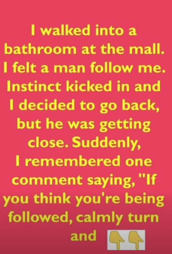 Suddenly, she remembered a post about a woman being followed that she had read recently: A top comment said to never go into a public bathroom if followed. She promptly exited the bathroom and entered the main shopping area, but the man stayed close.