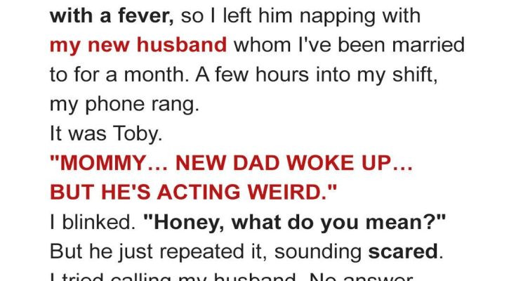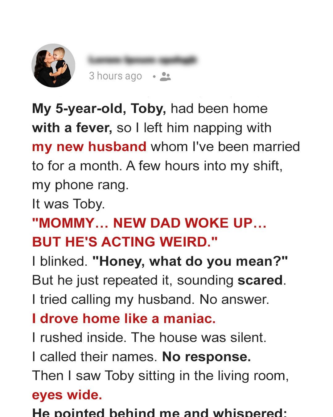 My 5-year-old, Toby, had been home with a fever, so I left him napping with my new husband, Mark, whom I had married just a month earlier. A few hours into my nursing shift, my phone rang. It was Toby. “Mommy,” he said softly, “new dad woke up… but he’s acting weird.”