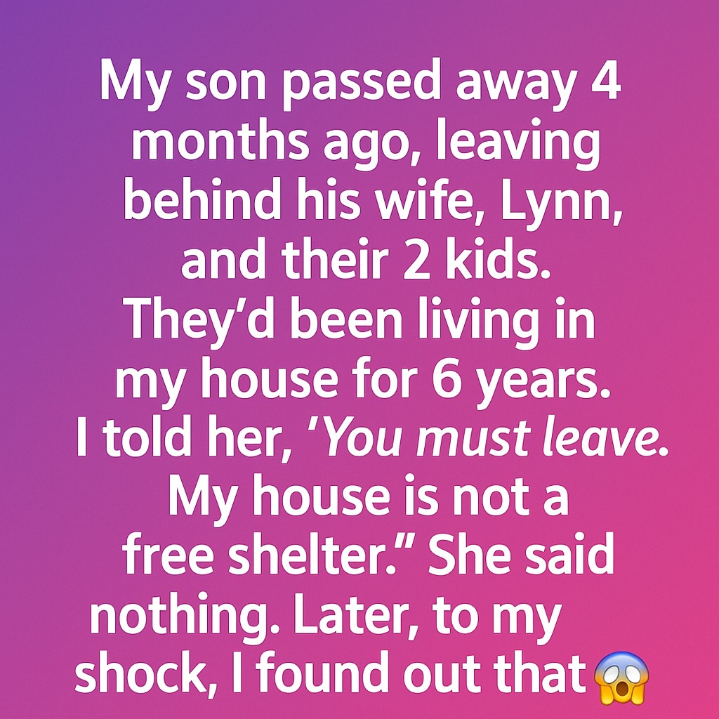When my son passed away four months ago, my world changed in ways I never imagined. He left behind his wife, Lynn, and their two little ones, who had been living in my home for six years. The house that once echoed with laughter now felt heavy with silence and memories. I was grieving, but I was also overwhelmed. One day, I told Lynn she had to move out — I thought space would help us both heal.