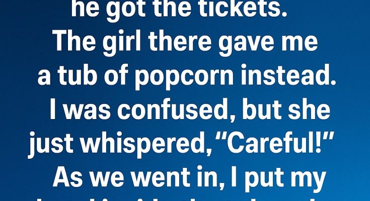 Her tone sent a chill down my spine. I thanked her awkwardly and joined him as we entered the theater. The lights dimmed, and we settled in. When I reached into the popcorn, I froze. My hand brushed against something sharp—an envelope folded tightly beneath the popcorn. My heart started racing.