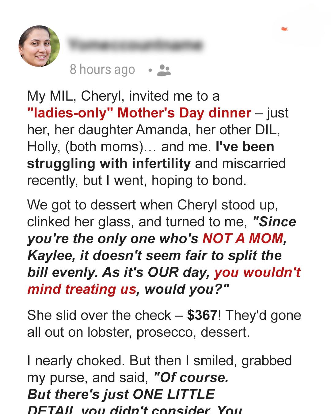 Kaylee had been through years of heartbreak trying to become a mom, so Mother’s Day was always painful for her. This year, her mother-in-law, Cheryl, insisted on a “ladies-only” dinner with Kaylee and her sisters-in-law, both of whom had young children. Cheryl showered them with gifts, toasted to their motherhood, and excluded Kaylee from every celebration. At the end of the meal, Cheryl slid the $367 bill toward Kaylee, calling it her “gift” to the “real moms.” Though hurt, Kaylee smiled and quietly paid only for her meal.