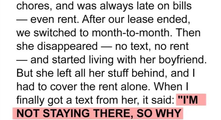One day, Milly suddenly left to stay with her boyfriend, leaving most of her belongings behind. When I texted her about rent, she said she wasn’t paying since she wasn’t living there. I was shocked and ended up covering the full rent for two months while she ignored all my messages. Finally, I warned her that if she didn’t respond, I’d assume she moved out. She never replied, so I spoke to the landlord, who changed the locks after confirming she was no longer on the lease.