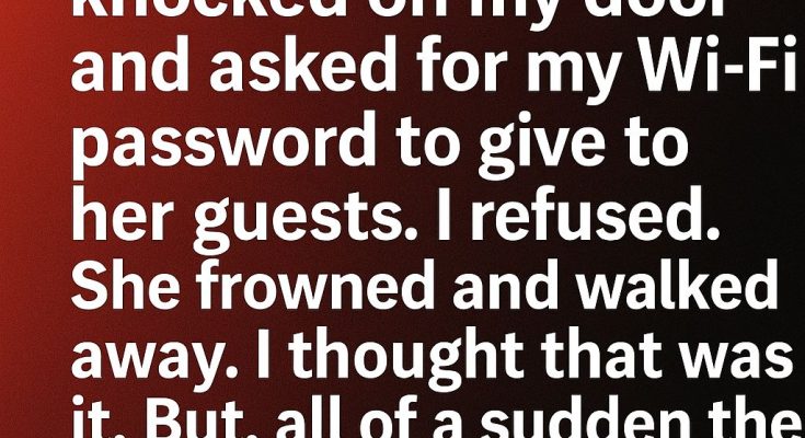 It was my neighbor. She smiled awkwardly and asked if she could have my Wi-Fi password to give to her guests because theirs wasn’t working. I was a bit surprised and politely said no, explaining that I prefer to keep my network private. She frowned, muttered a quick “Okay, thanks anyway,” and walked back to her place. I figured that was the end of it.