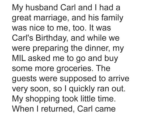 My husband Carl and I had a great marriage, and his family was nice to me, too. It was Carl’s birthday, and while we were preparing dinner, my MIL asked me to go and buy some more groceries. The guests were supposed to arrive very soon, so I quickly ran out. My shopping took little time. When I returned, Carl came out of the house and accused me of ruining his birthday. It turned out that his mom…