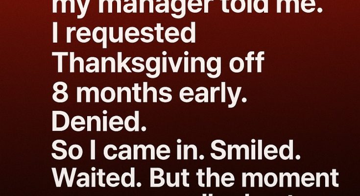I was the only one working holidays for 4 years. “No kids means no holidays,” my manager told me. I requested Thanksgiving off 8 months early. Denied. So I came in. Smiled. Waited. But the moment everyone walked out that door, I immediatel …sent in my resignation email—with a two-sentence note: