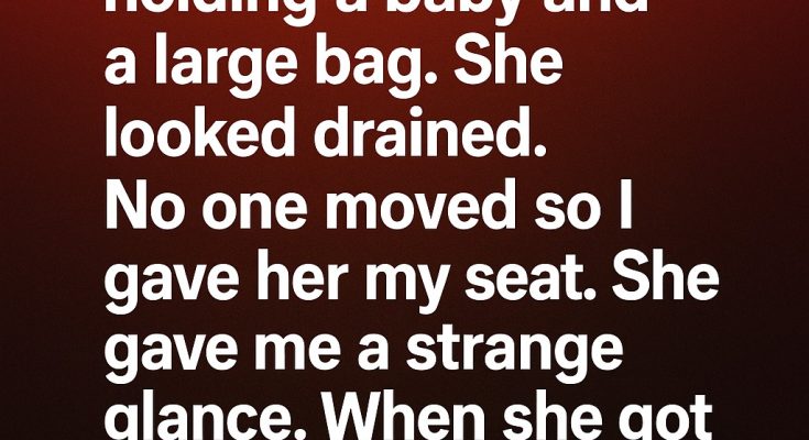 A woman stepped in holding a baby and a large bag. She looked completely exhausted, her eyes red-rimmed and her shoulders drooping. No one offered her a seat, so I slowly stood up, even though my back ached, and gave her mine. She looked at me strangely, almost as if she wanted to say something but couldn’t. I just smiled, thinking maybe she was too tired to respond.