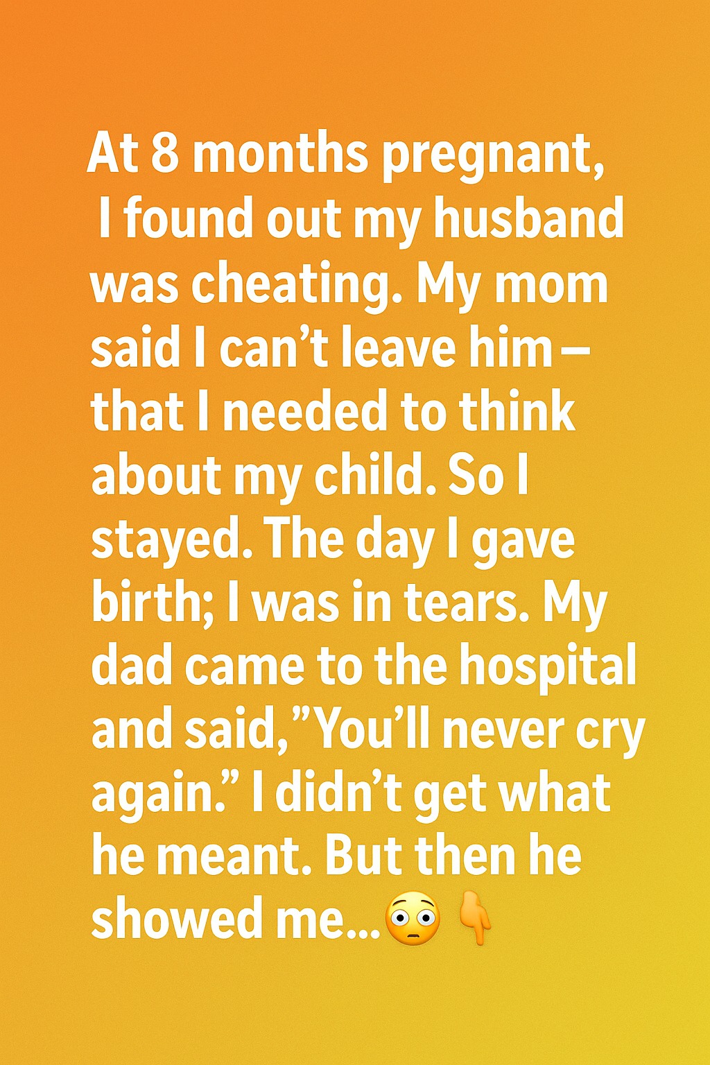 At eight months pregnant, I discovered something that shattered my heart. My husband, the man I had built my dreams with, was being unfaithful. I sat on the edge of my bed, holding the evidence in my trembling hands. I felt my baby move inside me, and tears streamed down my face. When I told my mom, I expected comfort. Instead, she sighed and said, “You can’t leave him right now.