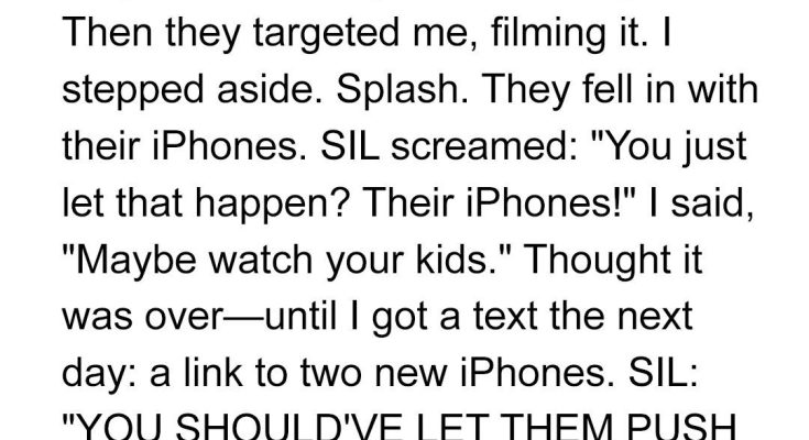 At the last second, I stepped aside, and they fell in instead, phones and all. Jessica’s reaction? She didn’t ask if they were okay. She gasped, “Their phones!” and immediately blamed me. I calmly reminded her that maybe she should’ve been watching them. The next morning, I woke up to a text from Jessica with a link to two very expensive phones, demanding I replace them.