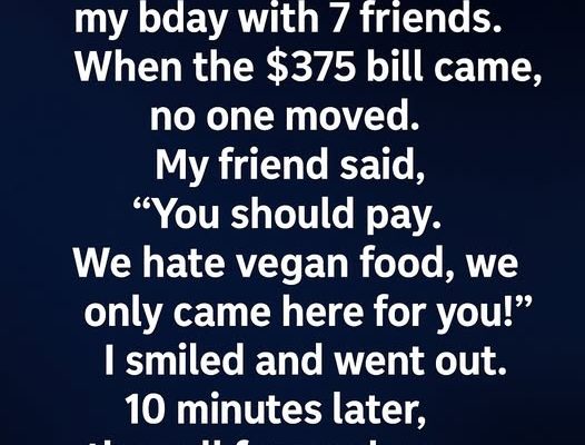 But when the $375 bill arrived, the table went silent. Not a single hand reached for a wallet. One friend finally spoke, “You should pay.