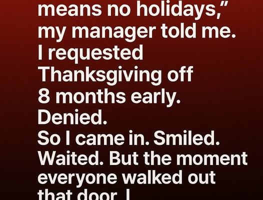 I still work hard, still cover shifts when needed—but now, it’s my choice. And every Thanksgiving, I raise my glass to the moment I walked out of that door not just as an employee—but as someone who finally chose self-worth over silence.
