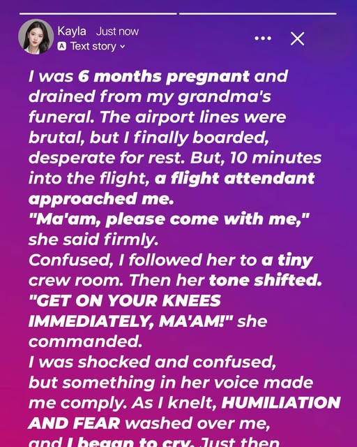 But just ten minutes into the flight, a flight attendant approached and gently said, “Ma’am, could you please come with me?” Confused, I followed her to a small crew area near the back. Her expression turned serious as she asked me to kneel carefully. My heart raced — I didn’t understand why.