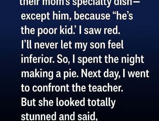 “I never said that,” she explained gently. “Your son didn’t need to bring a dish because he already gave something special—his favorite toy to the shelter. I told the class his kindness fed the soul more than food ever could.” My throat tightened.