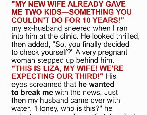 I was waiting for my appointment at the clinic when I heard a voice I hadn’t heard in years. My ex-husband stood there with his new wife, proudly expecting a child, and made a thoughtless remark about how she had given him what I never could. For a moment, old pain flickered—but it vanished as quickly as it came.