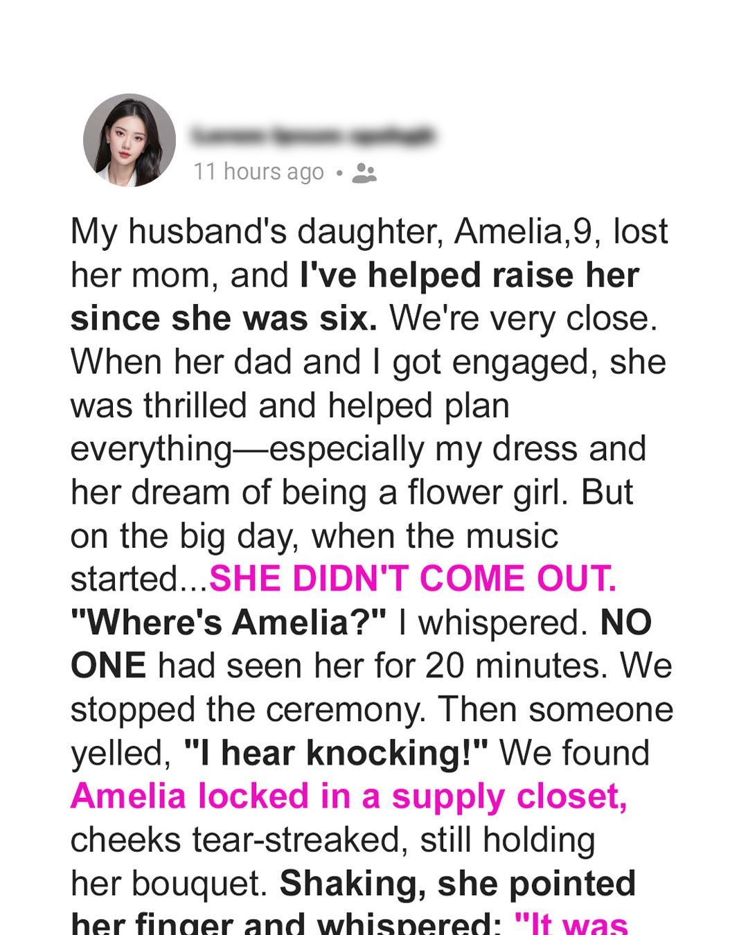 Amelia had been so excited for this day. Ever since her dad and I got engaged, she had dreamed of walking down the aisle, scattering petals like a princess from her storybooks. We had grown so close over the years — through bedtime stories, baking adventures, and quiet talks before bed. I wanted this day to be as magical for her as it was for us. But instead, something — or someone — had taken that joy away.