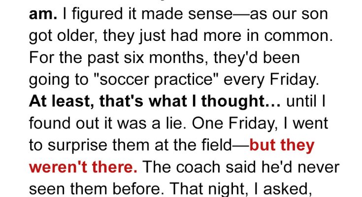 For six months, my husband Derek and our 13-year-old son Harry left every Friday night for what they said was football practice. They always returned tired, grass-stained, and full of stories about drills and plays. One day, I decided to surprise them with homemade cookies at the stadium—only to find the field completely empty. Confused and uneasy, I realized something wasn’t adding up.