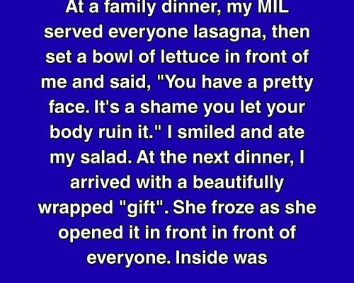 At a family dinner, my MIL served everyone lasagna, then set a bowl of lettuce in front of me and said, “You have a pretty face. It’s a shame you let your body ruin it.” I smiled and ate my salad. At the next dinner, I arrived with a beautifully wrapped “gift”. She froze as she opened it in front of everyone. Inside was a handwritten journal titled: “Words That Hurt & Words That Heal – For Families Who Want to Grow Closer.”