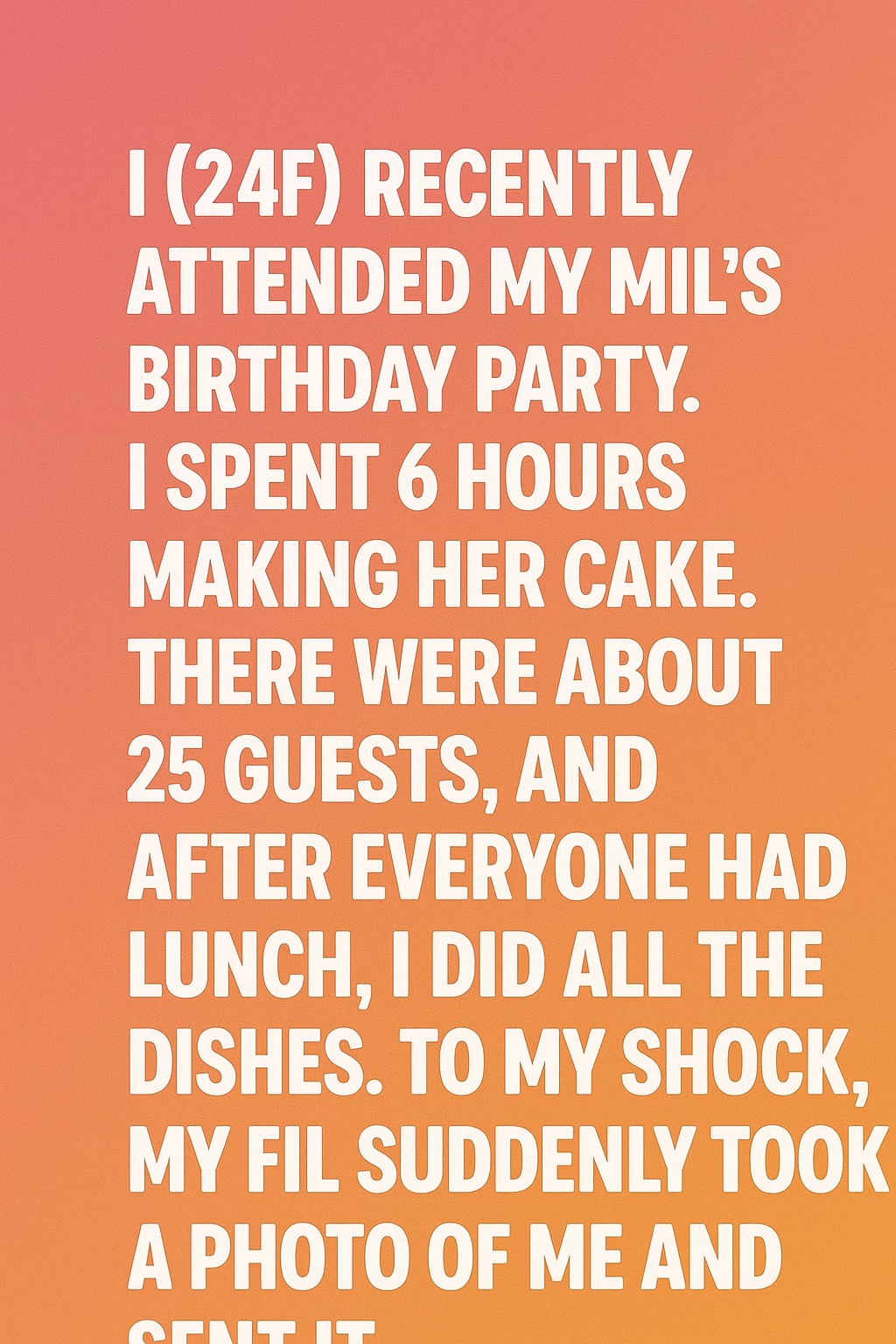 I (24F) recently attended my MIL’s birthday party. I spent 6 hours making her cake. There were about 25 guests, and after everyone had lunch, I did all the dishes. To my shock, my FIL suddenly took a photo of me and sent it… to the entire family group chat with the caption: “Now this is what a perfect daughter-in-law looks like.” At first, I thought it was a compliment, but as more messages poured in from extended relatives praising me for being “obedient” and “well-trained,” I felt uneasy. It sounded less like appreciation and more like I was being shown off as an example of what other women “should” do.