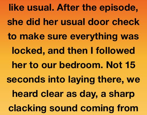 My wife and I were on the couch, watching our favorite cooking show like we did every Friday night. After the episode ended, she did her usual routine of checking the doors to be sure everything was secure. I followed her to the bedroom, the soft glow of the hallway light fading behind us. We had just settled into bed, the calm of the evening wrapping around us like a blanket. Then, out of nowhere, we heard a sharp clacking sound from the kitchen.