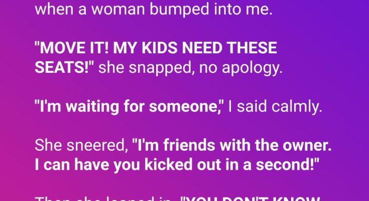 I was waiting for my friend at a cafe, about to sit at a table by the window, when a woman bumped into me. “MOVE IT! MY KIDS NEED THESE SEATS!” she snapped, no apology.”I’m waiting for someone,” I said calmly. She sneered, “I’m friends with the owner. I can have you kicked out in a second!”